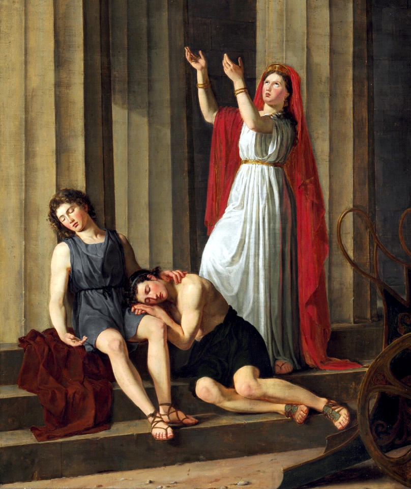 Herodotos (Histories I §31) and Ploutarkhos (Greek Anthology III §18) tell the story that there was a festival of Hera going on in Argos, and during the festival the high priestess Kudippe [“glorious horse”] was to be brought to the temple in a wagon pulled by oxen in order to preside over the sacrifice. She sent her sons, Kleobis [“famous life”] and Biton [“lively”] to fetch the oxen, but when they couldn’t find them in time, they yoked themselves to the wagon and pulled their mother to the sacrifice—no mean feat, as wagons are heavy and the distance some five miles. The Argives, hearing the story, praised the young men to their mother, and in her joy at her sons’ strength and piety, she prayed to Hera that her sons might be granted whatever lot is best to men. They sacrificed, feasted, and the boys laid down to sleep in the temple, but never again woke up, the goddess having granted the mother’s prayer.